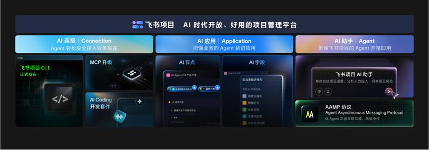 而飞书项目 AI 助手和 AAMP 则是从 AI 基建的视角进一步放大飞书项目的价值,即让 AI 以飞书项目的特色能力和企业知识数据为锚,进一步帮助每一个用户和 AI 一起用好飞书项目;另一方面让平台和智能体之间互通协作,让组织 AI 流程和个人 AI 生产力形成合力,释放极致生产力。