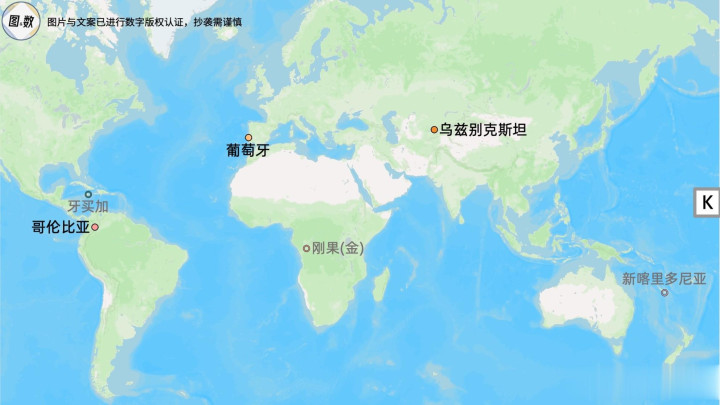 K组的主题是贸易:乌兹别克斯坦是古代丝绸之路的重要途径地,撒马尔罕、塔什干与布哈拉均为来往商队的集散地;葡萄牙则是航海大发现的主要参与者,并在之后发展了三角贸易,而哥伦比亚正是三角贸易中黑奴的输入地以及贵金属的输出地。