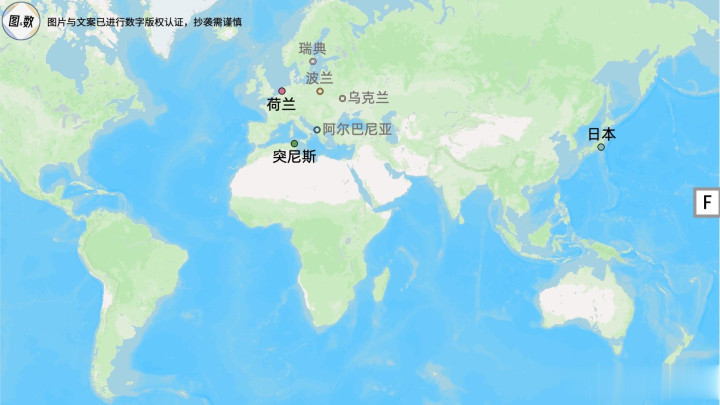 F组的主题是“失败的海上霸主”:突尼斯的昵称是“迦太基之鹰”,迦太基曾经是地中海的霸主,但最终被罗马击败;荷兰被称为“17世纪的海上马车夫”,但在三次英荷战争后,海上霸主的地位被英国取代;日本海军在二战期间曾猖獗一时,但美国海军通过珊瑚海海战、中途岛海战、瓜岛海战、菲律宾海海战等一系列作战对其进行了毁灭性打击。